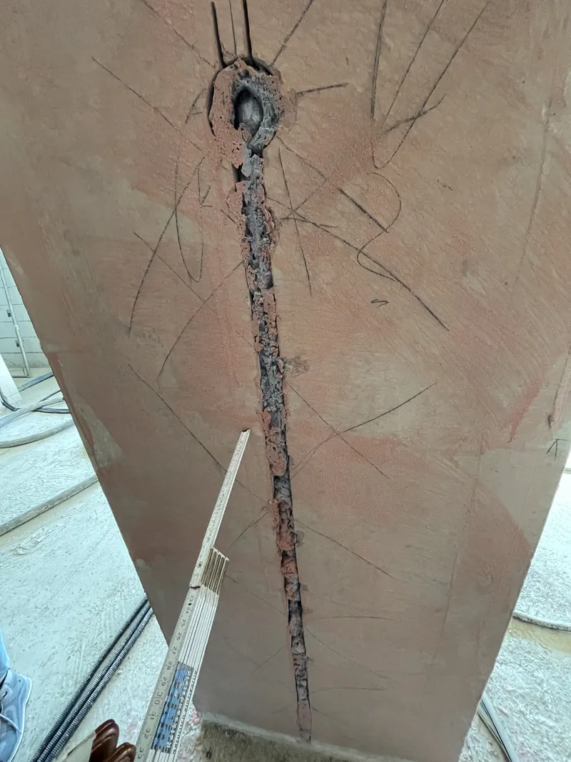 Häufig werden bei Elektroinstallationen tragende Bauteile unzulässig geschlitzt, wie hier eine Betonstütze. – Bild: Thomas Möller, Dipl.-Ing. (FH)