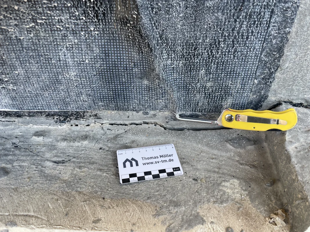 Hinterläufige Abdichtungen, wie hier im Sockelbereich einer Bodenplatte, sind ein häufiger Mangel. – Bild: Thomas Möller, Dipl.-Ing. (FH)
