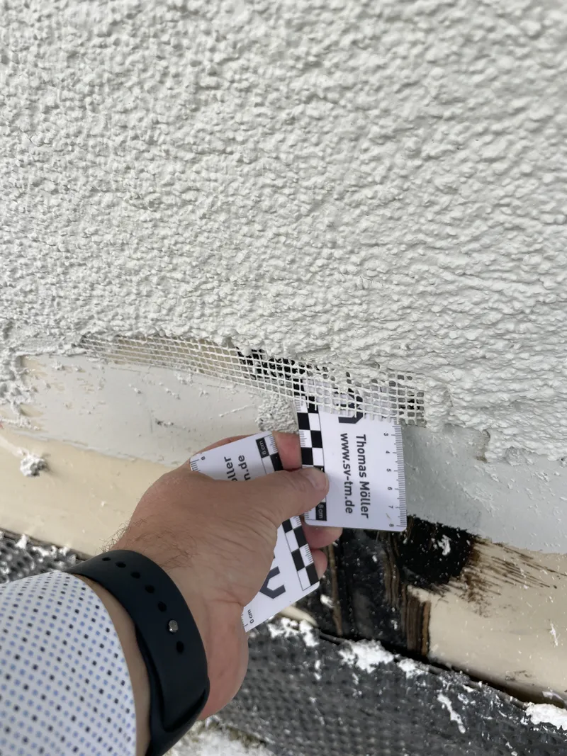 Innenausbau / Nassräume / Fassade Prüfung der Badabdichtungen, Estriche (Feuchtigkeit, Randdämmstreifen, Risse), Putzflächen sowie fertiggestellter Fassaden- und WDVS-Bereiche – insbesondere Anschlüsse an Fenster, Dach und Sockel.